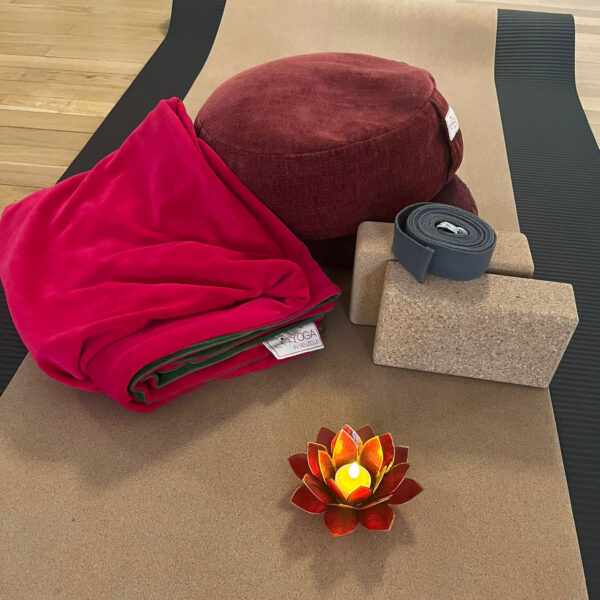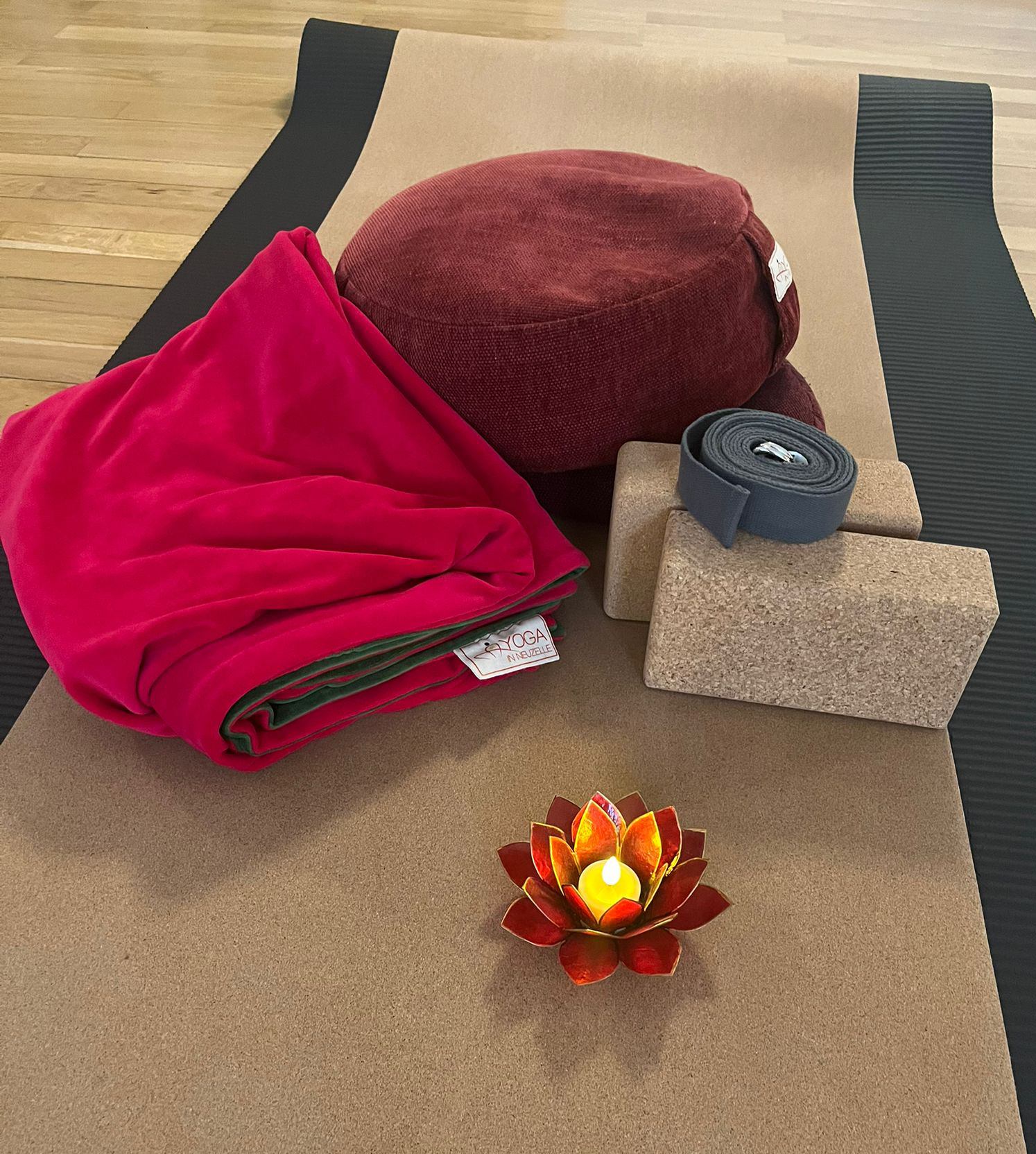 Yogamatten. Kissen. Decken und anderes spezielles Equipment sind vorhanden.